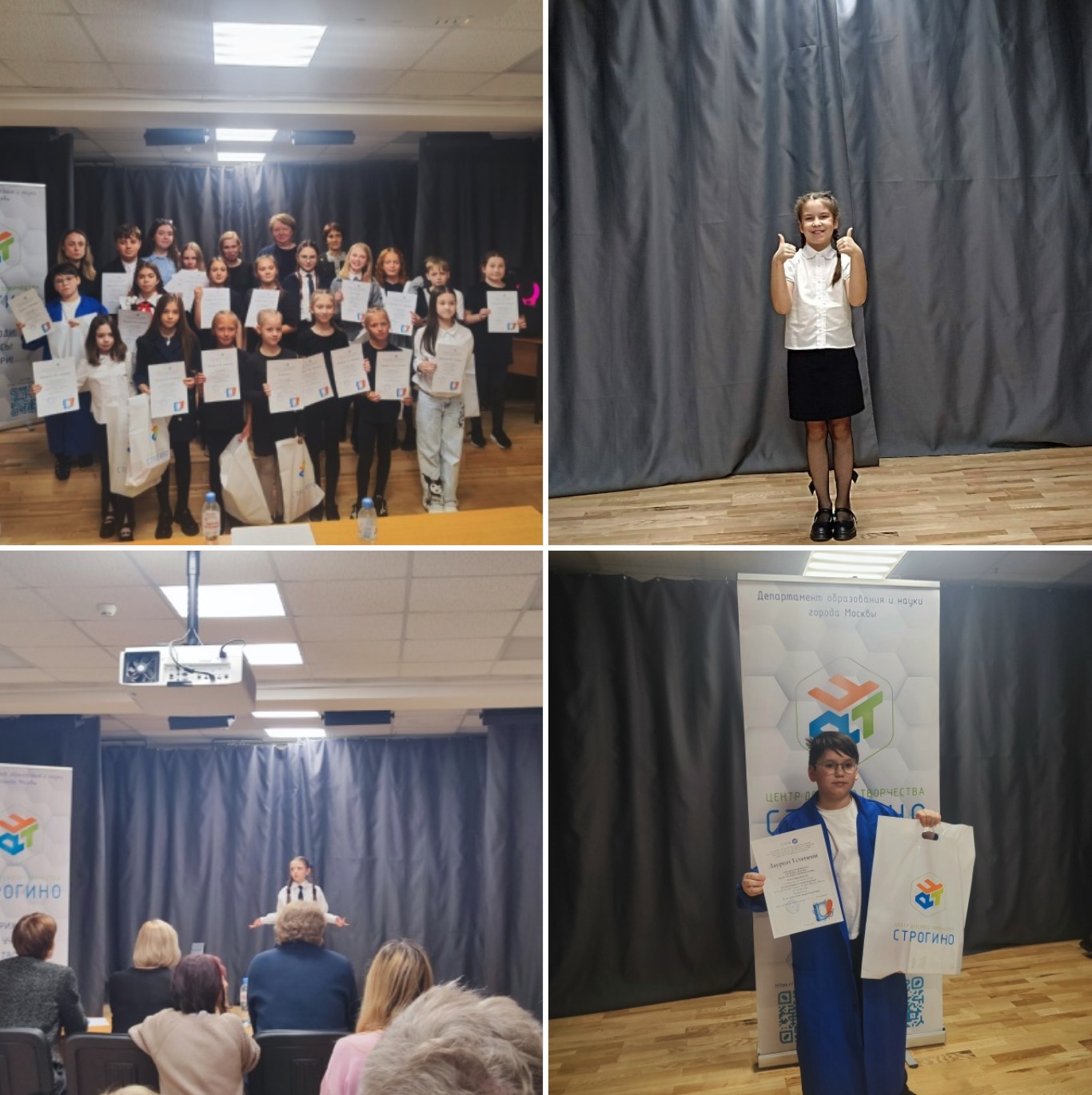 Два юных артиста из объединения «Театр-студия «Шум» Центра творчества «Гермес» и Школы 1794 им. А.С.Чуфистова выступили в номинации «Художественное слово». В возрастной категории 8-9 лет с произведением Агнии Барто «Болтунья» ученица театра-студии получила диплом Лауреата II степени. А ученик, выступивший с произведением Эдуарда Успенского «Академик Иванов» в возрастной категории 10-11 лет, получил диплом Лауреата I степени.