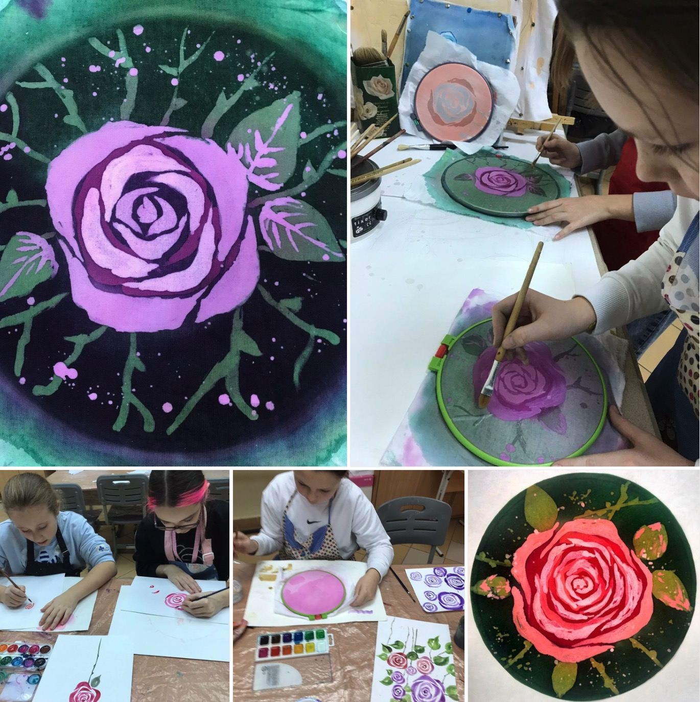 Девчонки с трепетом и любовью к своей маме рисовали розы, используя технику батика.