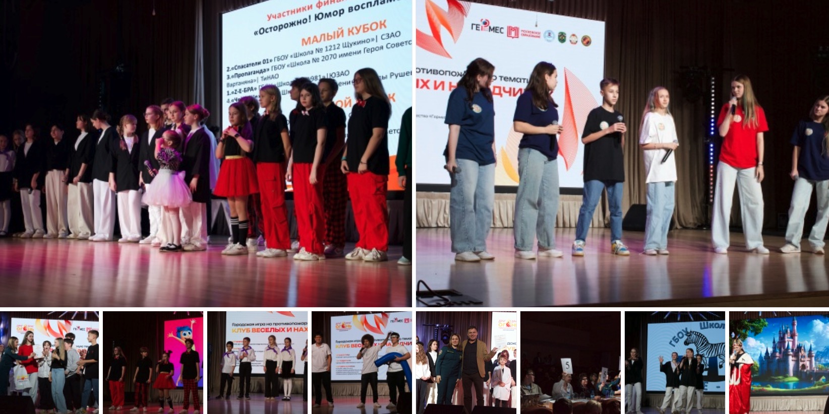 На сцену вышли команды московских школ, демонстрируя зрителям и членам жюри невероятный зажигательный юмор. За почетные звания сражались восемь команд, разделившись на две категории – «Большой Кубок» и «Малый Кубок».